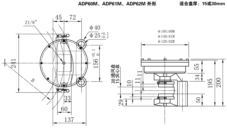 對于"B" 尺寸和安裝數(shù)據(jù),請看ADP60M-ADP61M-ADP62M 總裝圖