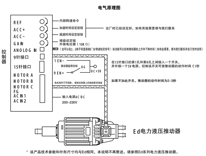 結構特點: 該產(chǎn)品由控制器和Ed 電力液壓推動器兩部分組成(注意:在控制器帶電或兩個LED燈發(fā)光期間,禁止打開控制器或接觸控制器內部,否則有觸電的危險!!! )